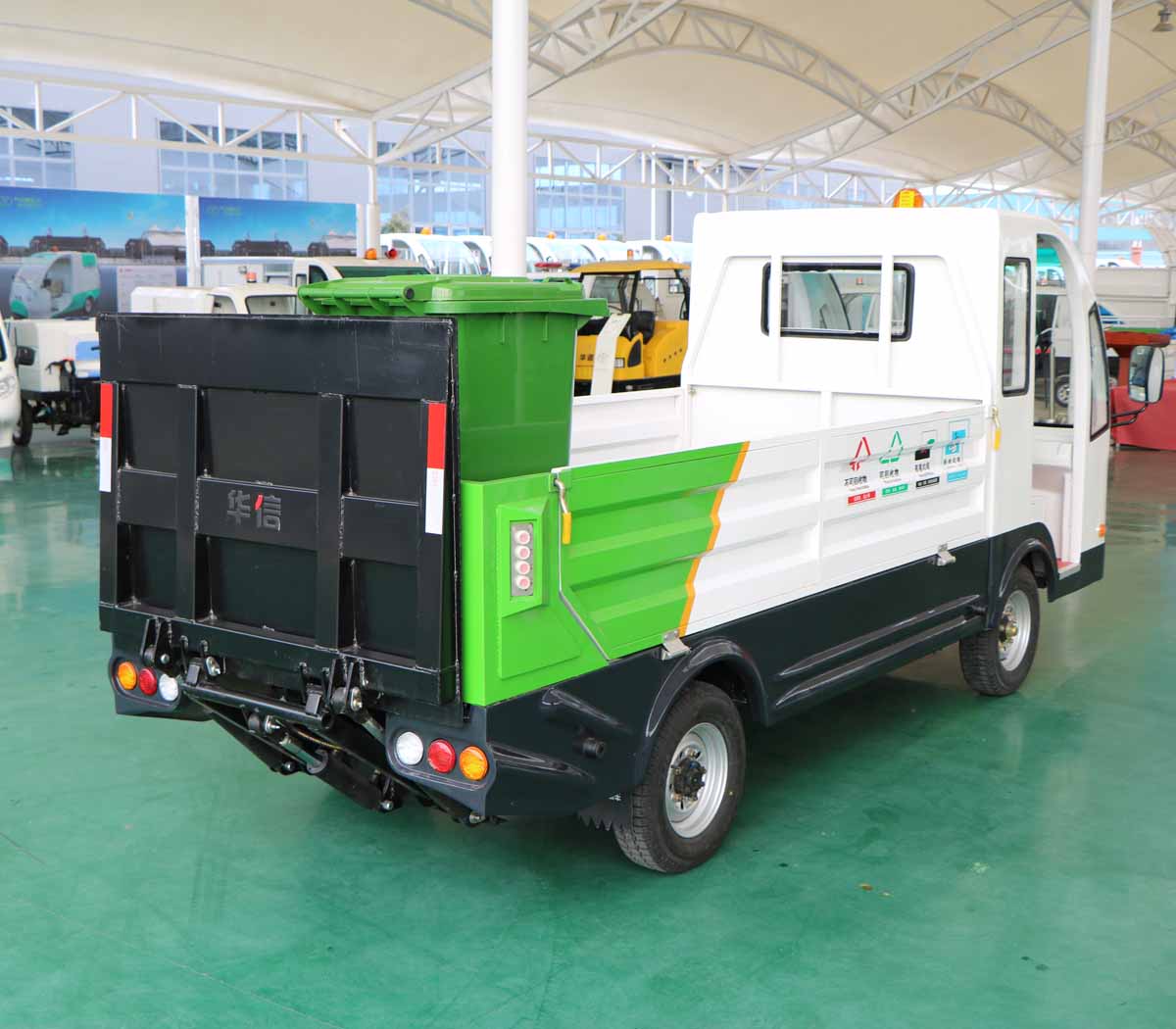 2 | 車輛尾部采用液壓升降尾板裝置,只要一人操作即可完成垃圾桶或其他干式貨物的裝卸 |